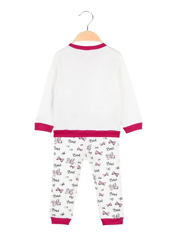 Pyjama long bébé fille en coton chaud, composé de : t-shirt manches longues, encolure ronde, boutons clips sur l’épaule, poignets et bordure finale élastiqués, imprimé dessin Minnie sur le devant ; pantalon avec imprimés, taille élastique, poignets élastiques aux extrémités.