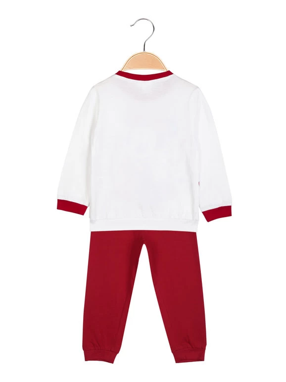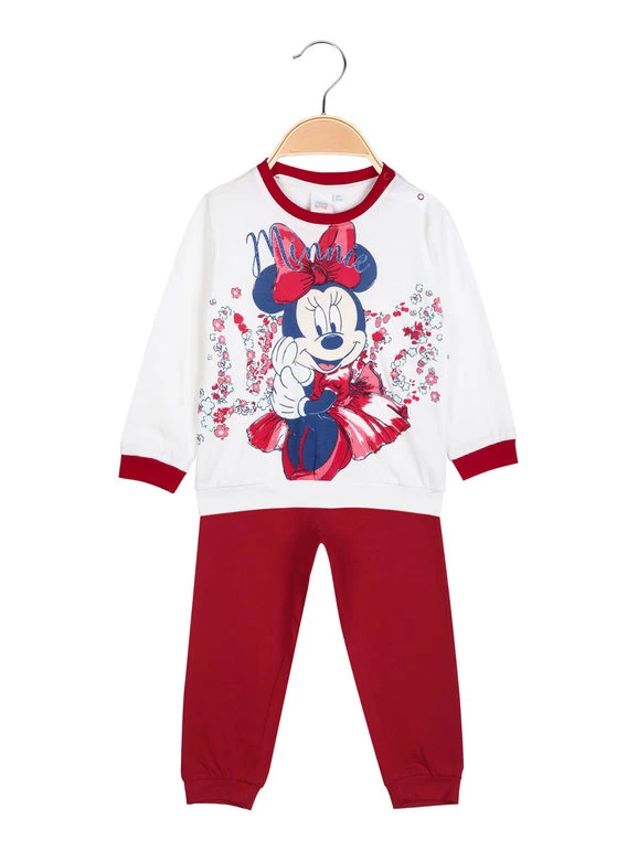 Pyjama long bébé fille en coton, composé de : t-shirt manches longues, encolure ronde, boutons clips sur l’épaule, poignets élastiqués et bord final de couleur contrastée, imprimé dessin Minnie sur le devant ; pantalon de couleur unie, taille élastique, poignets élastiques aux extrémités.