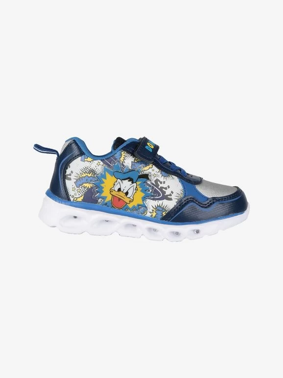 Baskets pour enfants, tige en similicuir, empiècements métalliques, imprimé Donald Duck à l’extérieur, fermeture à scratch et lacets élastiques, doublure en tissu, cheville rembourrée, semelle intermédiaire avec lumières clignotantes, semelle en caoutchouc antidérapante.