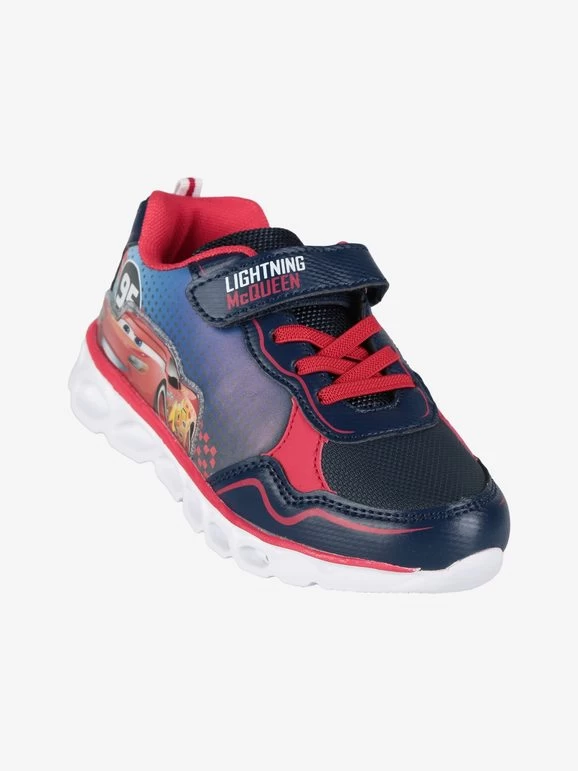 Baskets pour enfants, tige en similicuir, imprimé Cars à l’extérieur, fermeture à scratch et lacets élastiques, doublure en tissu, cheville rembourrée, semelle intermédiaire avec lumières clignotantes, semelle en caoutchouc antidérapante.