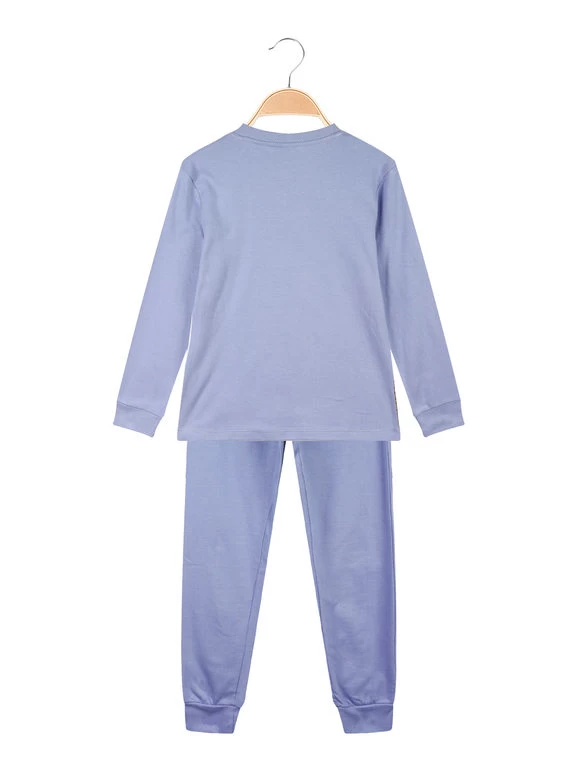 Pyjama fille en coton chaud, composĂ© de : T-shirt Ă manches longues avec poignets, boutons sur l’encolure, imprimĂ© sur le devant avec paillettes dĂ©coratives, doublure chaude en coton ; pantalon de couleur unie, ceinture Ă©lastiquĂ©e, poignets aux extrĂ©mitĂ©s, intĂ©rieur en coton chaud.