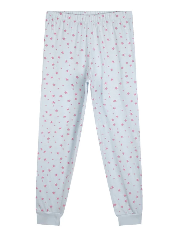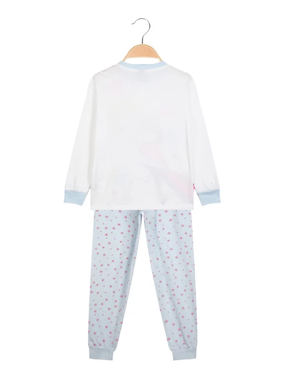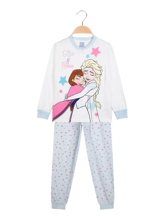 Pyjama long en coton pour fille, composé de : t-shirt à manches longues, encolure ronde avec boutons, poignets et bord final élastiqués, imprimé dessin Frozen sur le devant ; pantalon coordonné avec imprimés, taille élastique, poignets élastiques aux extrémités.