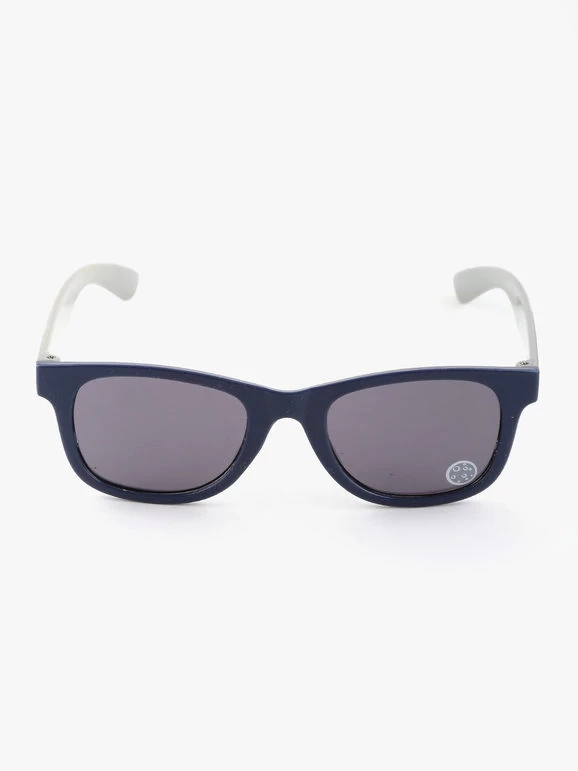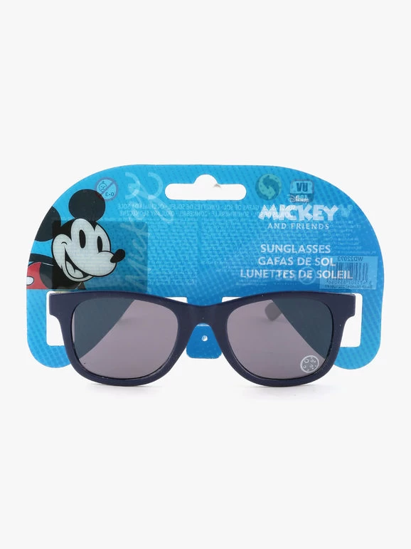 Monture avec verres foncés, branches avec imprimés Minnie (rose, corail et bleu clair) et Mickey Mouse (bleu, orange et bleu foncé). Longueur des tiges 12 cm. Protection UV400.