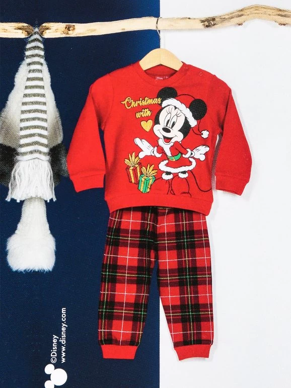 Pyjama long de Noël bébé fille en coton chaud, composé de : t-shirt manches longues, boutons à l’encolure, poignets élastiqués et pate finale, imprimé Minnie sur le devant ; pantalon coordonné, imprimé tartan, ceinture élastiquée, poignets élastiqués aux extrémités.