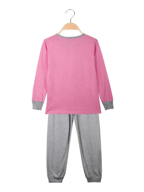 Pyjama long en coton composé de : T-shirt à manches longues, encolure ronde avec boutons, motif imprimé sur le devant ; pantalon de couleur unie, avec ceinture élastiquée, poignets aux extrémités.